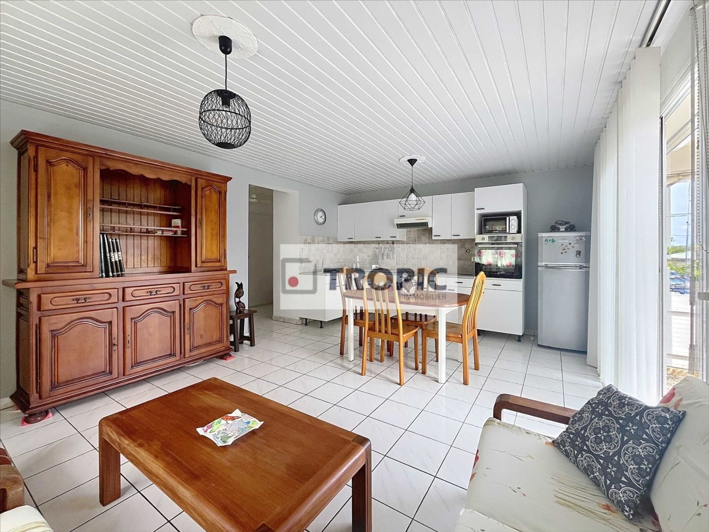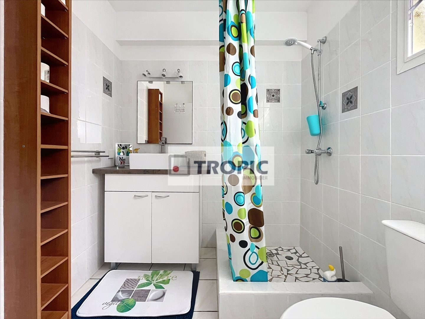 Le logement comprend un séjour climatisé, un espace cuisine, une chambre avec rangements, ainsi qu'une salle d'eau avec WC et un espace buanderie.